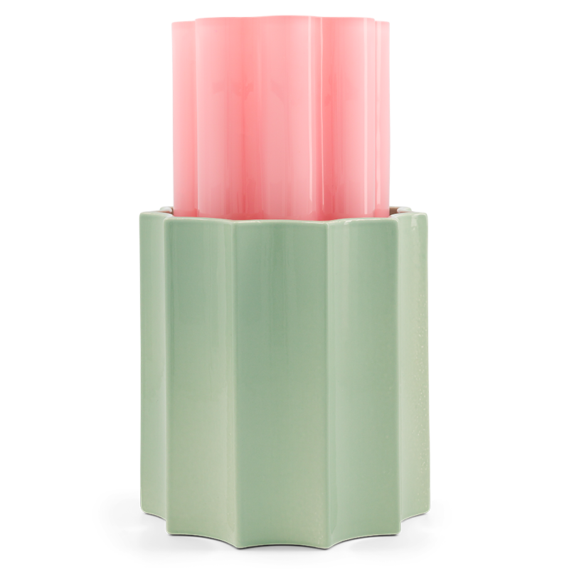 A sculptural blend of glazed almond-green ceramic and mouth-blown candy-pink glass. Modular, watertight, and interchangeable — crafted in Portugal for a touch of refined, contemporary elegance.