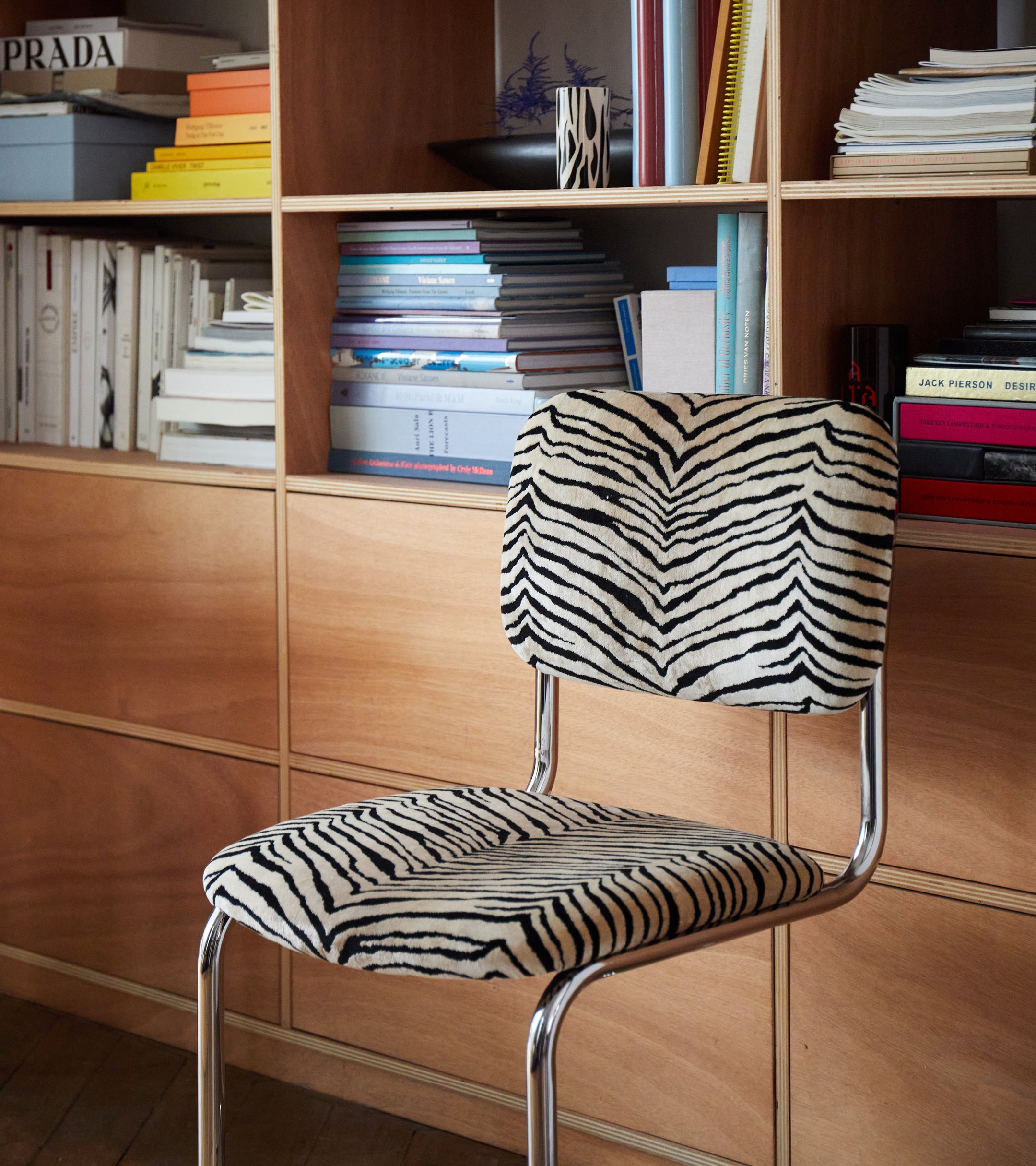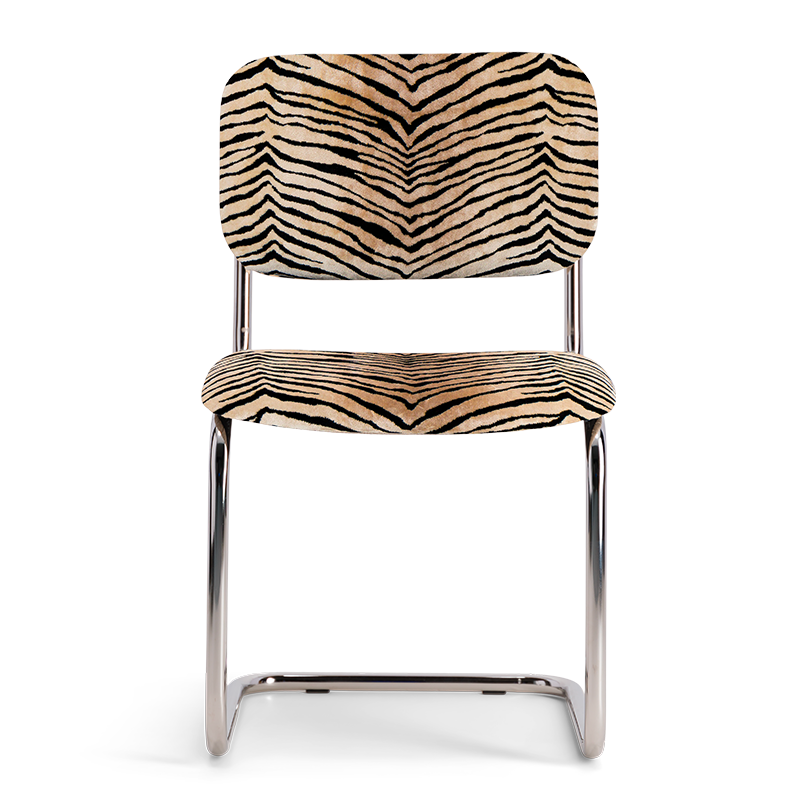 A statement of modern elegance, the Classica Chair combines a bold tiger-pattern velvet seat with a sleek tubular steel base. Handmade in Italy, it brings warmth, texture, and timeless style to any interior