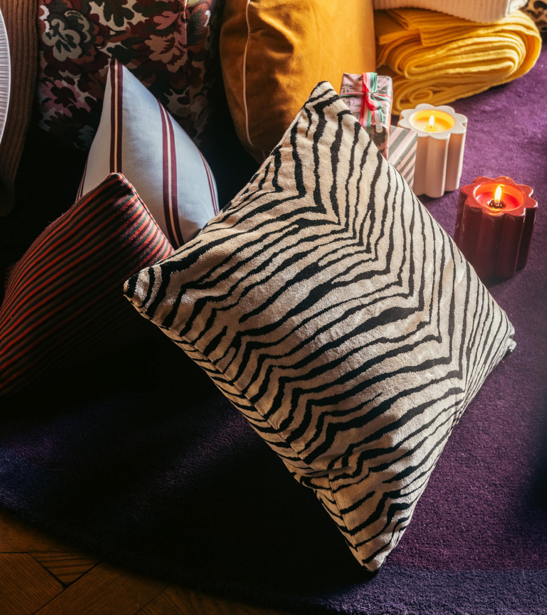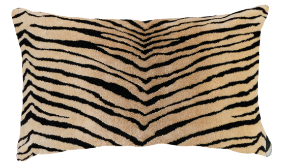 Bold and luxurious, the Carino cushion in tiger-patterned velvet is a true statement piece. Crafted in France from a rich jacquard blend, it adds a touch of wild elegance to any interior – from classic to contemporary.