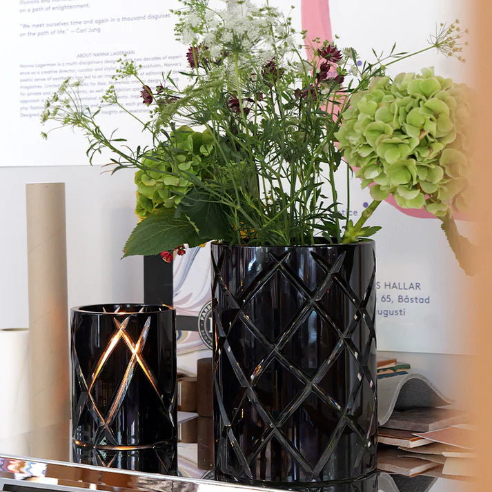 Elevate your home décor with the Hurricane Crystal Lamp Medium Black, a stunning Bohemian crystal piece crafted for those seeking a luxurious and bespoke touch. Expertly hand-cut by skilled artisans, the black crystal facets reflect light beautifully, creating an enchanting and artful glow in any space.