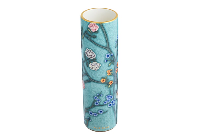 Elevate your space with the Elie Saab Antique Chinoise Lilium Flower Vase, a refined statement piece that combines Oriental artistry with modern elegance. Inspired by traditional Chinese garden paintings, this vase features delicate birds and blooming trees painted in soft spring tones of pink, green, and yellow on a serene sky-blue background.