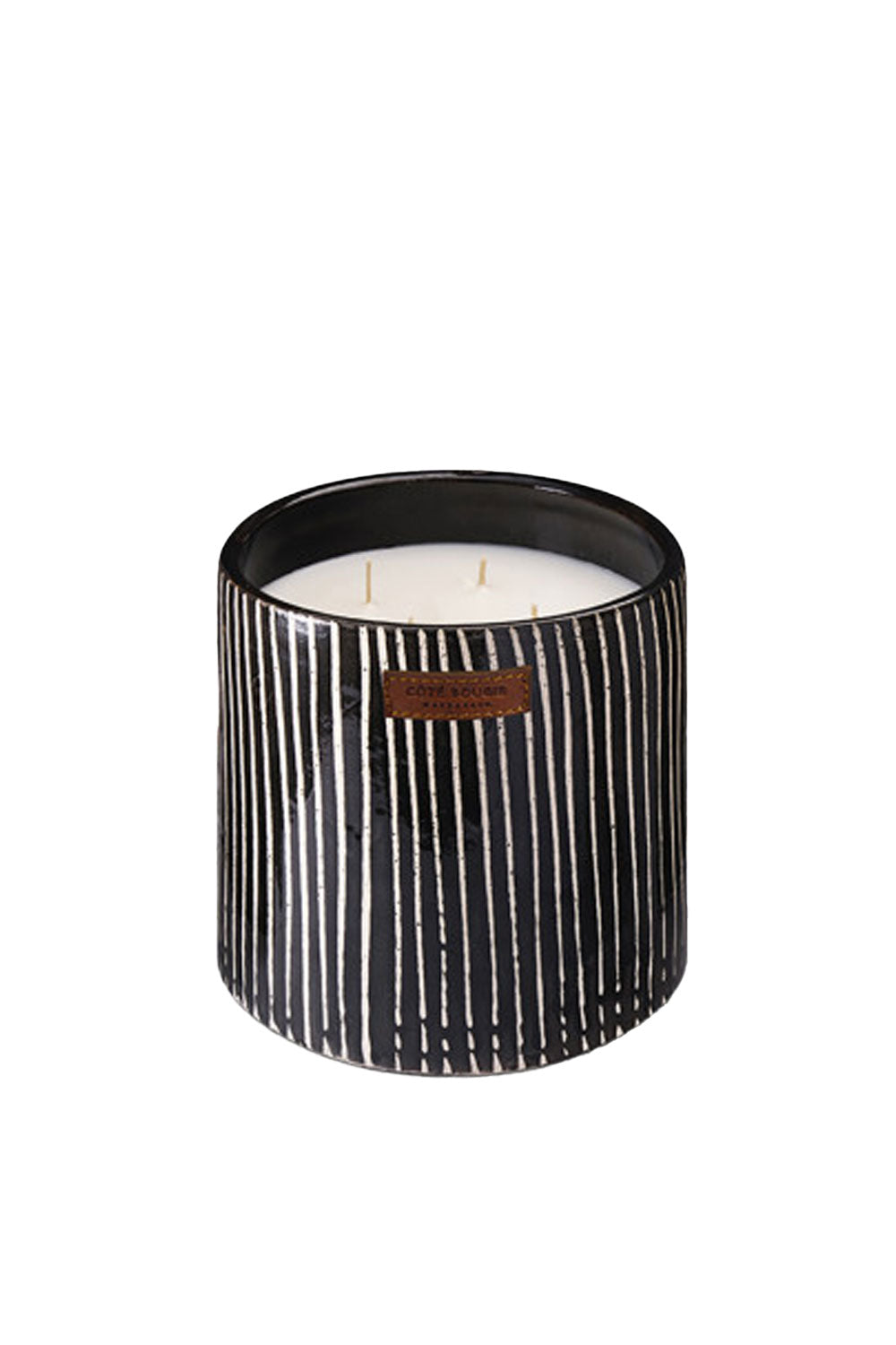Zebra Black Scented Candle — a bold, refined piece crafted in Marrakech. The black ceramic jar features fine, hand-painted white stripes by skilled artisans, making each candle truly unique. Its elegant fragrance, created in Grasse, infuses your space with a sophisticated ambiance.